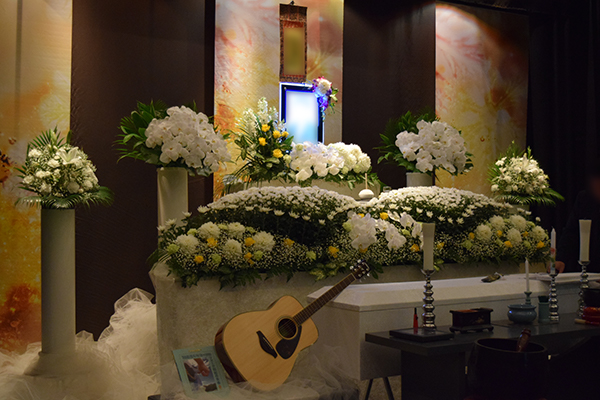 日蓮宗菩提寺を中心とした仏式葬儀の中で「故人らしい」お葬式を執り行いました。故人若かりし頃から愛用のギターと大好きだったフォークソングの楽譜を、柩のお足元に飾らせていただきました。喪主(奥様)の大好きな胡蝶蘭をたくさん用いてのお見送りでした。