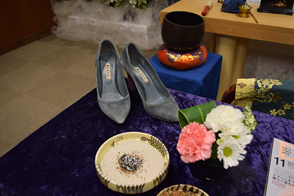 ご焼香テーブルにはお洒落な故人様の愛読雑誌と靴